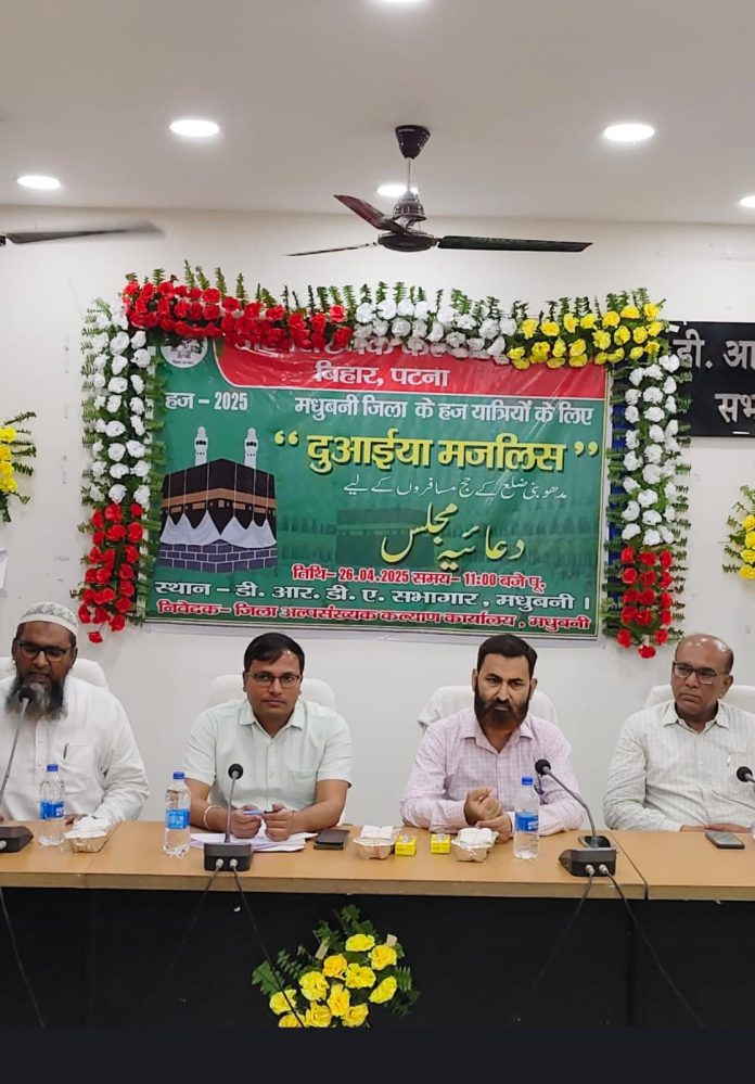 अल्पसंख्यक कल्याण विभाग, बिहार पटना के निदेश के आलोक में हज- 2025 के मुबारक यात्रा के संदर्भ में मधुबनी जिला से हज यात्रा हेतु जाने वाले कुल *69* हज यात्रियों के लिए *दुआइया मजलिस* कार्यक्रम का आयोजन आज दिनांक 26.04.2025 को 11 बजे पूर्वाहन में डी0आर0डी0ए0, मधुबनी के सभाकक्ष में किया गयाl जिस में सभी हज यात्रियों को हज यात्रा के दौरान प्रस्थान से लेकर वतन वापसी तक वर्ती जाने वाली सभी संबंधानियों के बारे में जिला समन्वय द्वारा सभी हाजियों को अवगत कराया गया। सभी हाजियों के लिए कार्यक्रम में उपस्थित मुफ्ती, मौलाना एवं अन्य उपस्थित लोगों द्वारा दुआ पढ़ी गई तथा सुरक्षित मुबारक यात्रा हेतु शुभकामना संदेश प्रेषित किया गया।