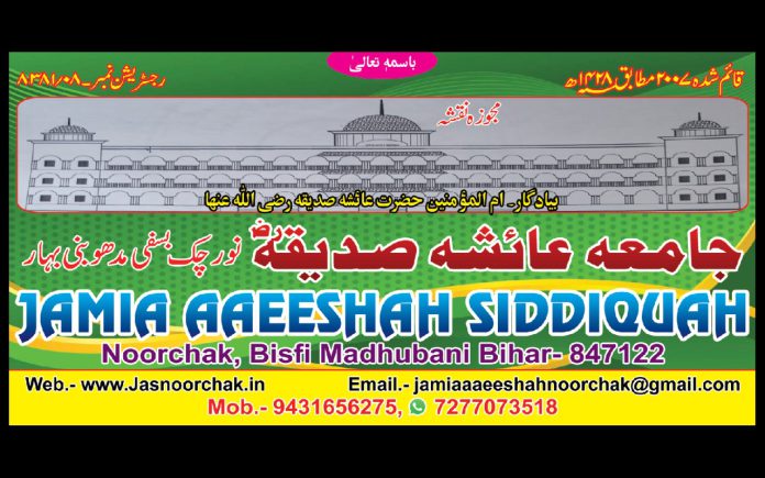 उत्तर बिहार का प्रसिद्ध और केंद्रीय शैक्षणिक संस्थान जामिया आयशा सिद्दीका (रज़ि.) नूरचक अपनी स्थापना के समय से ही शिक्षा और संस्कार के क्षेत्र में उल्लेखनीय योगदान देता आ रहा है। इस संस्थान की खासियत यह है कि यहां छात्राओं को न केवल शैक्षणिक रूप से बल्कि नैतिक रूप से भी सशक्त बनाया जाता है। यही कारण है कि यह संस्थान आज क्षेत्र में एक महत्वपूर्ण और विश्वसनीय शैक्षणिक केंद्र के रूप में जाना जाता है।
